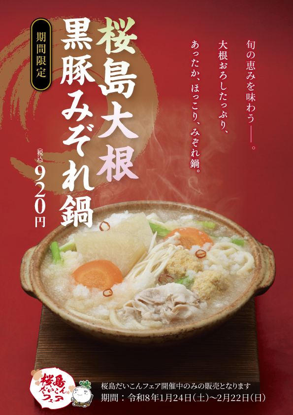 桜島だいこんフェアが開催されます! 2026/01/23 いつも各店をご利用いただきありがとうございます。 吹上庵全店・左膳全店・いちにいさん全店にて 桜島だいこんフェアが開催されます! 期間:令和8年1月24日(土)〜2月22日(日) 吹上庵 桜島大根黒豚みぞれ鍋 920円税込 左膳 桜島大根かき揚げそば 800円税込 桜島大根の天ぷら田楽 580円税込 いちにいさん 桜島大根しゃぶかつセット 1,200円 黒豚とうふ桜島大根添え 430円 ぜひご賞味ください。